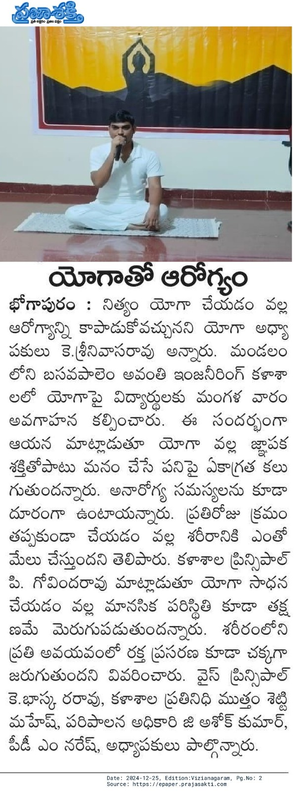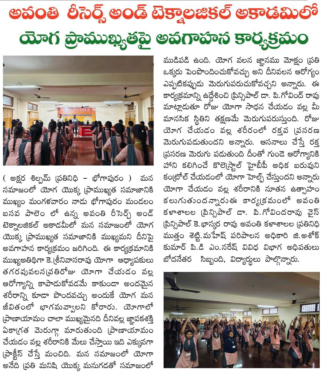 Mr. K Srinivasa Rao, Yoga Trainer motivated the students and conveyed the importance of making yoga an integral part of our daily life by extending the practice of yoga .